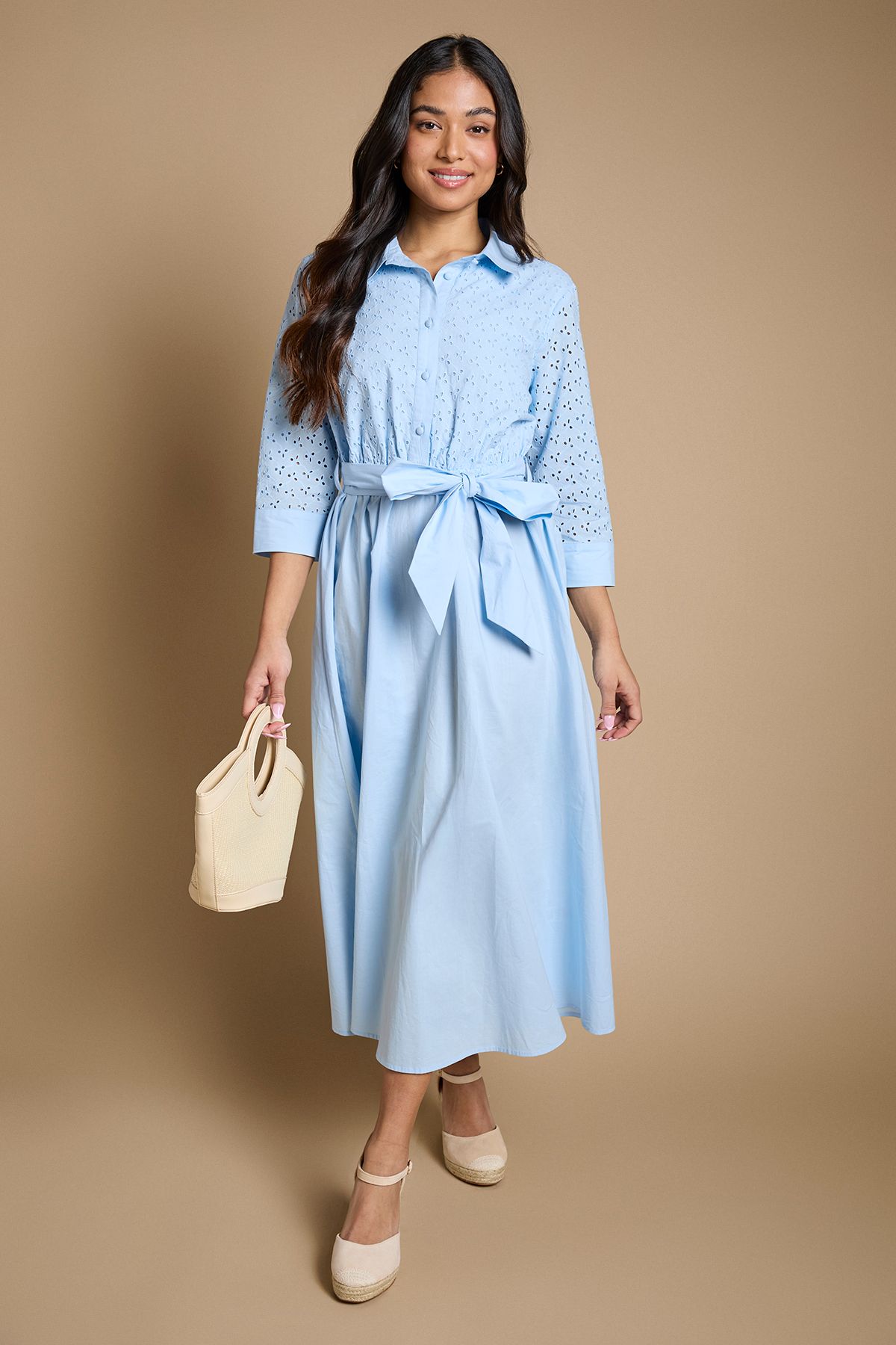 Dorothy Perkins Petite Contrast Broderie Belted Shirt Midi Dress Blue