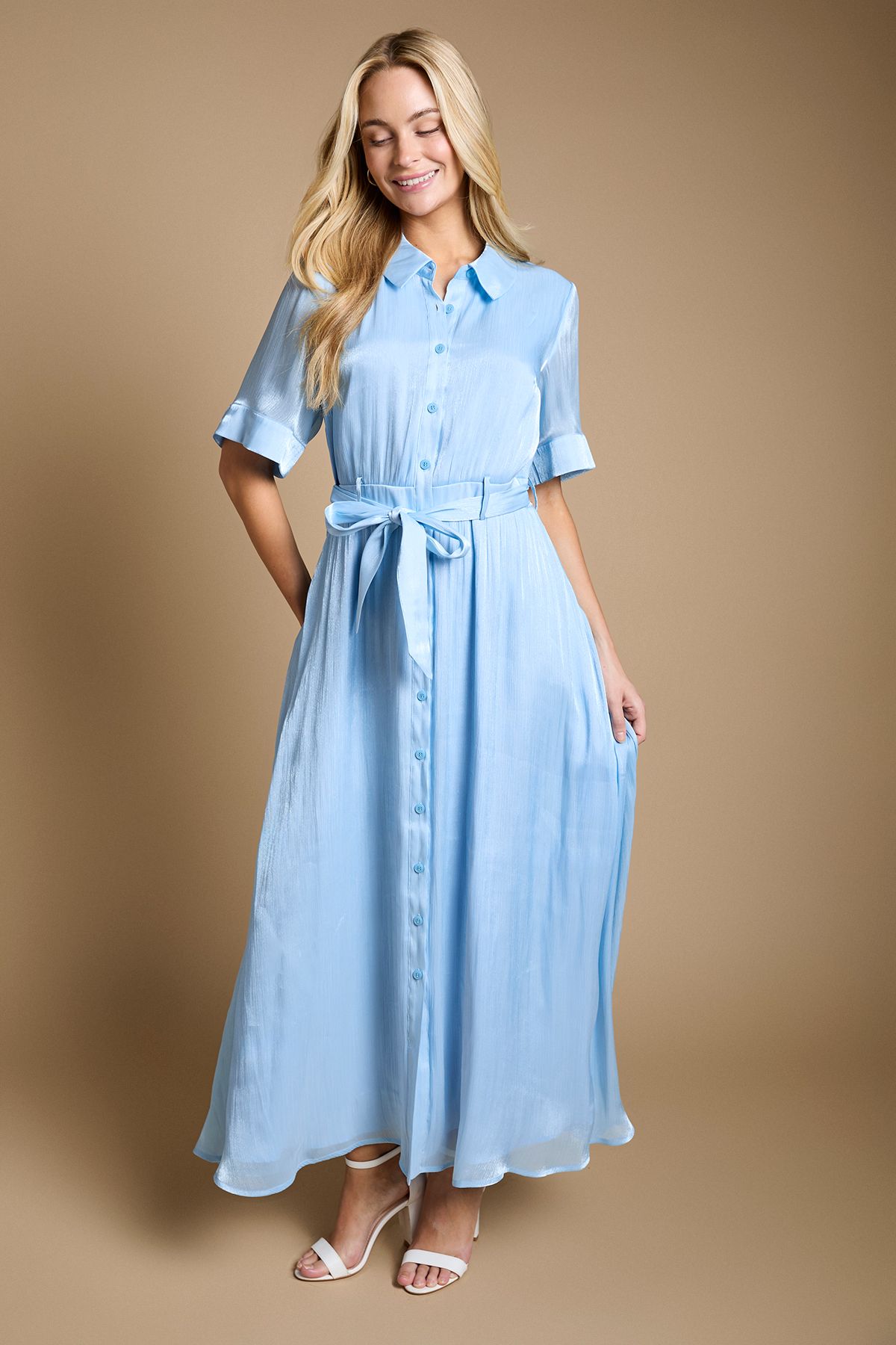 Dorothy Perkins Shimmer Belted Shirt Midi Dress Blue