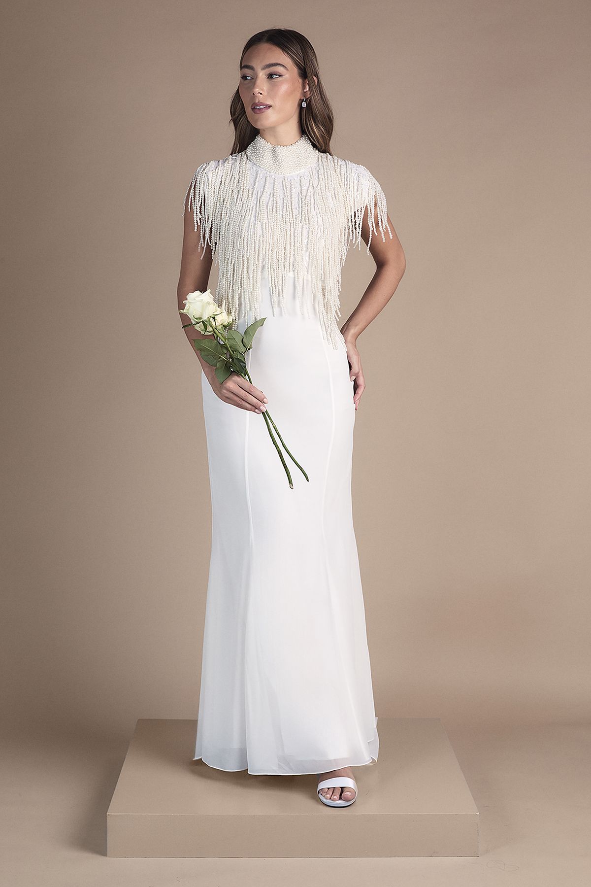 Coast Pearl Fringed High Neck Embellished Wedding Dress Ivory