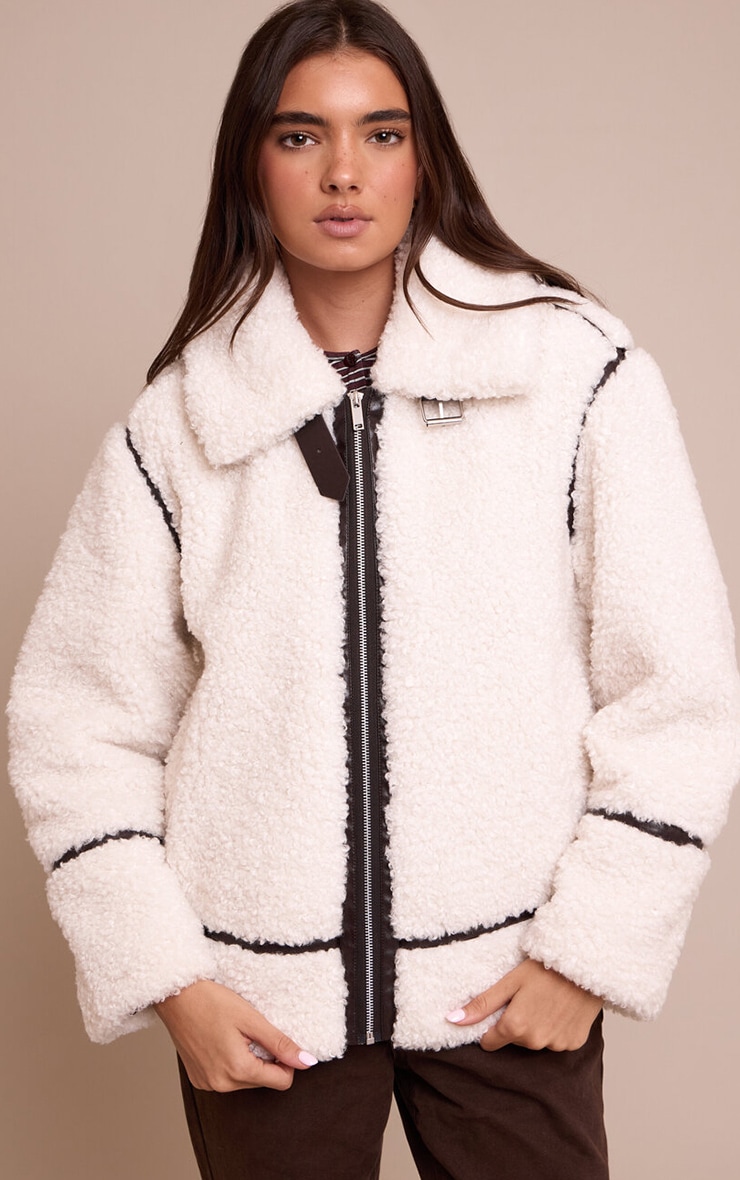 Cream Borg Faux Leather Contrast Coat